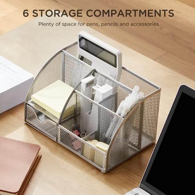 • 【LARGE CAPACITY DESKTOP ORGANIZER】FURNINXS desk organizer has 6 separate compartments and a sliding pull-out drawer, ideal desk storage for office supplies; suitable for small stationary supplies such as pens, pencils, markers, scissors, tape, notepads, lipsticks, makeup brushes