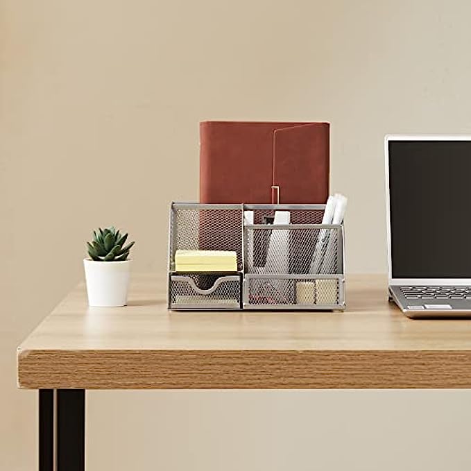 FURNINXS Mesh Desk Organizer with 7 Compartments, Office Desktop Supplies with Drawer, Metal Stationary Organizer Desk Caddy Pencil Holder, Silver